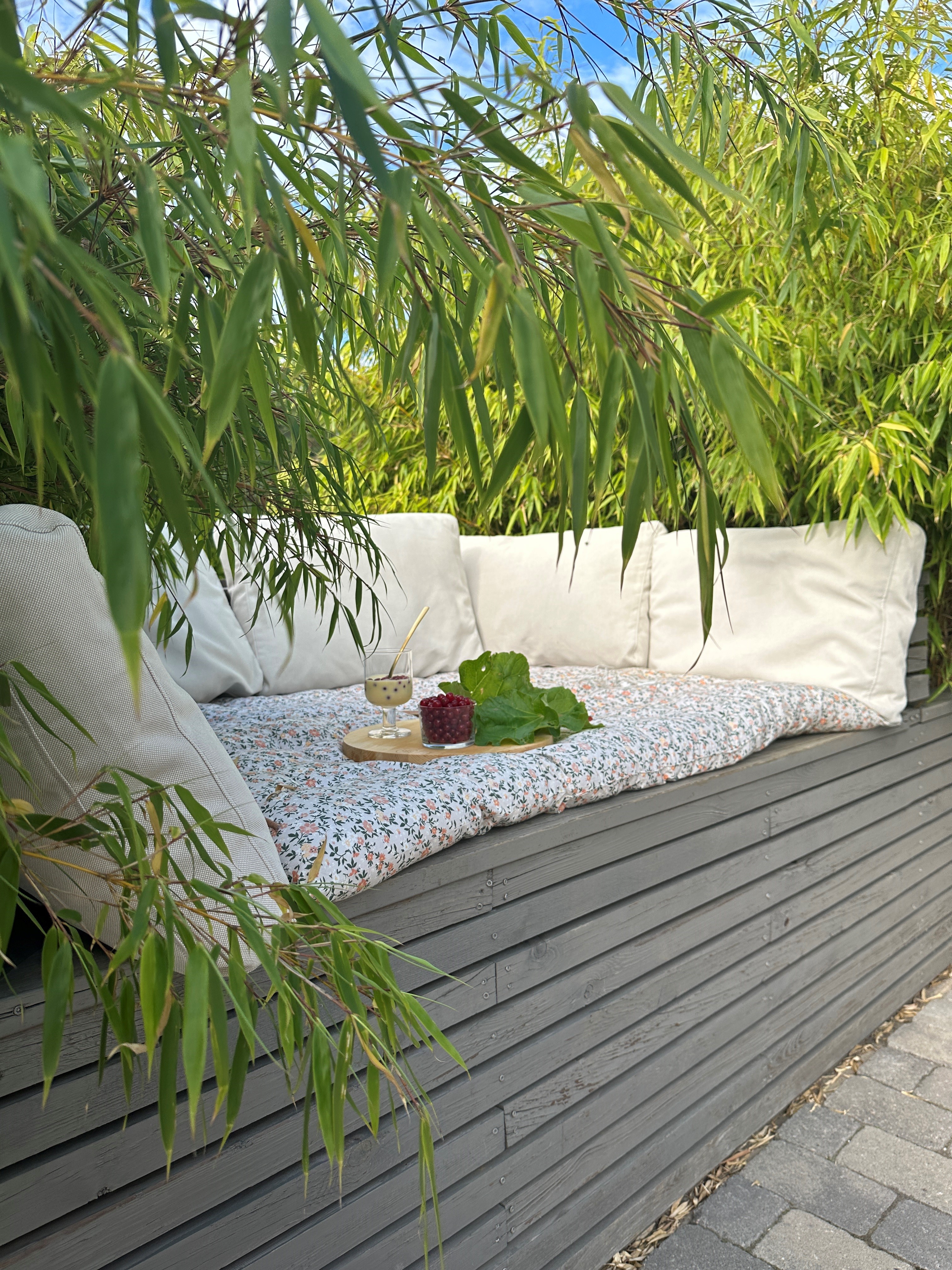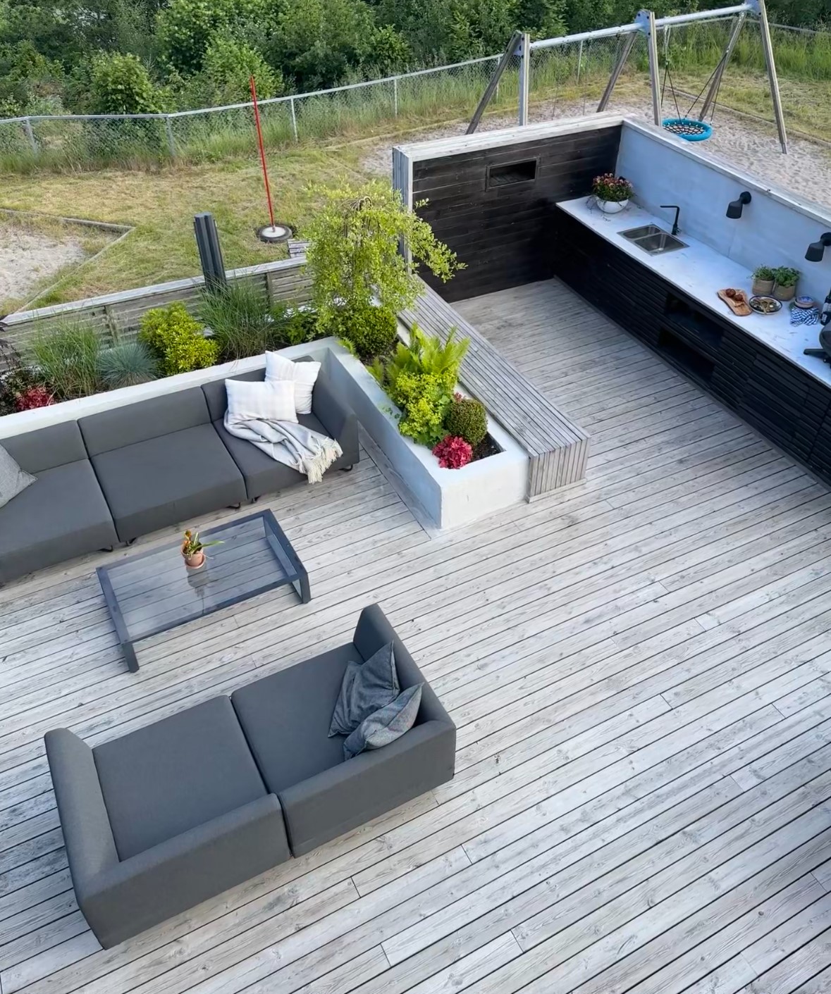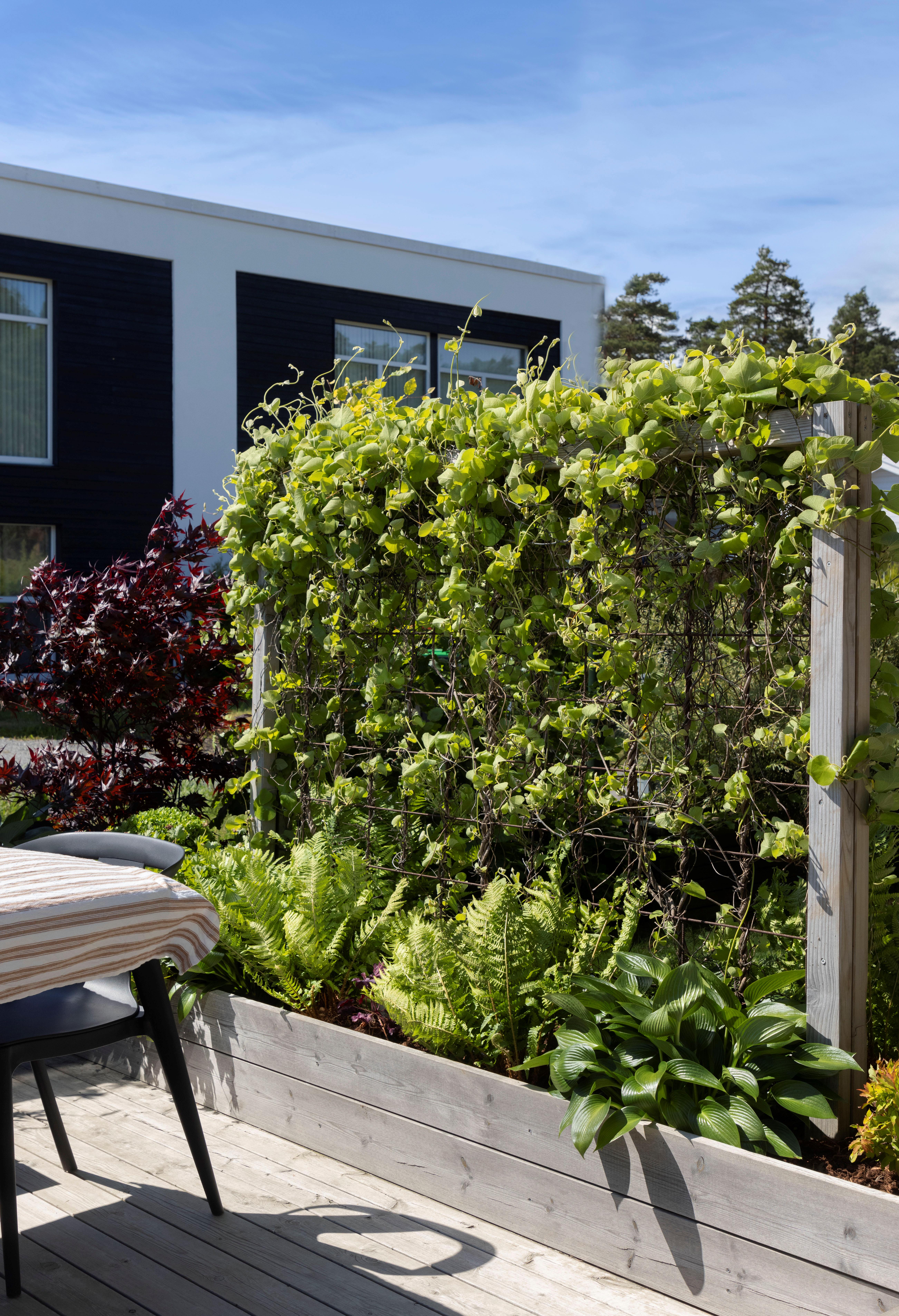 En av mine favoritter er å ramme inn plattinger eller pergola med en blomsterkasse. Gjerne litt bred og lang for å kunne lage store bed som bugner av planter på sommeren. Ønsker du ekstra skjerming kan man lage en klatrevegg til klatreplantene dine. Da får du en grønn naturlig vegg hele sommeren.