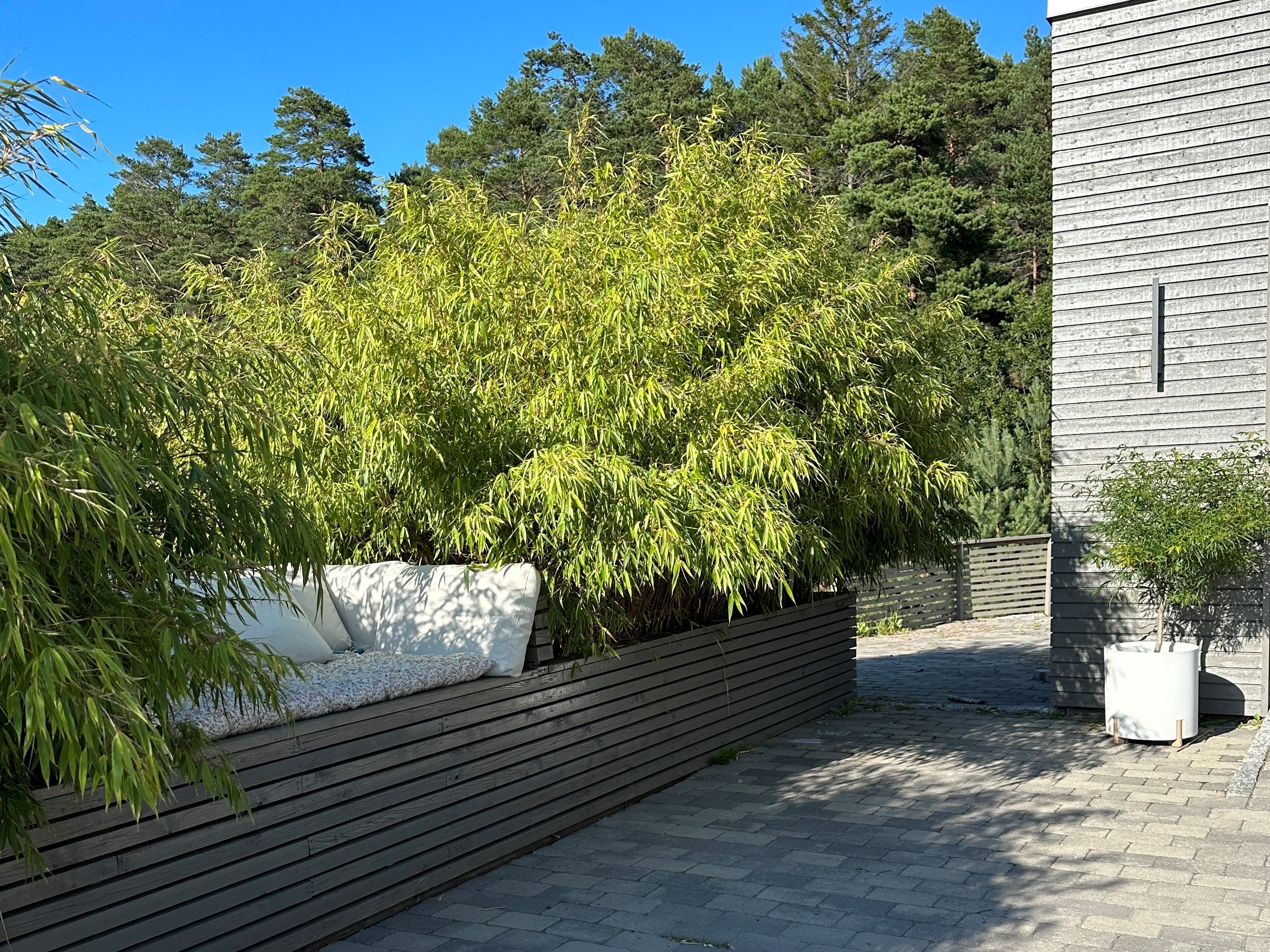 Vi har en stor og åpen innkjørsel som vi ønsket å lukke litt. Det passet seg ikke med hekk, men jeg ønsket allikevel følelsen av å være litt skjermet. På Plantasjens høstsalg fant jeg Bambus til 70% rabatt og kjøpte 6 stk små brune planter. De har vokst seg store og flotte på ca. 4 år, og dekker nå helt utrolig godt. Blomsterkassen er plassbygd, isolert med knotteplast og fylt med jord.